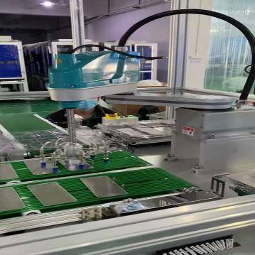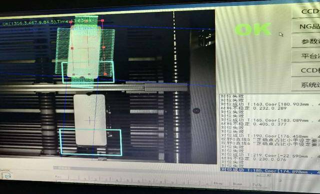 四元数机械手视觉分拣系统应用于手机盖板,末端工位识别抓取材料,到良品区与不良品区分盘放置,材料经前端检测机台,分开放置到同一条流水线上,视觉用于识别材料边沿,使吸盘准确抓取材料至料盘中。